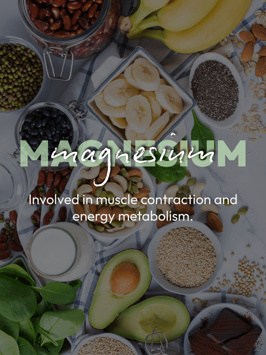 Magnesium supports muscle contraction and relaxation, energy metabolism (ATP production), and neuromuscular function.