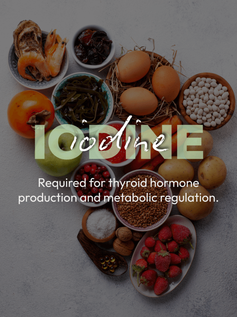 Iodine supports thyroid hormone production, which regulates metabolic rate and energy availability. Low iodine intake can impair thyroid hormone production and energy levels, indirectly affecting performance.